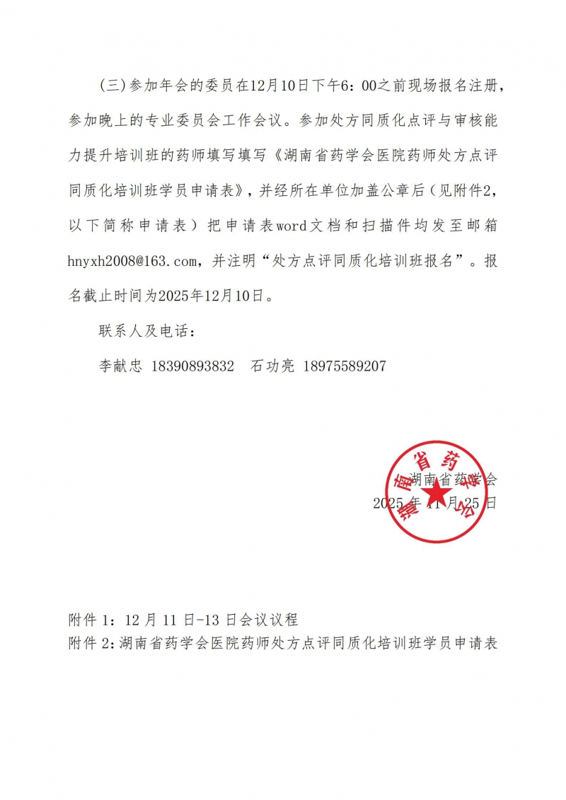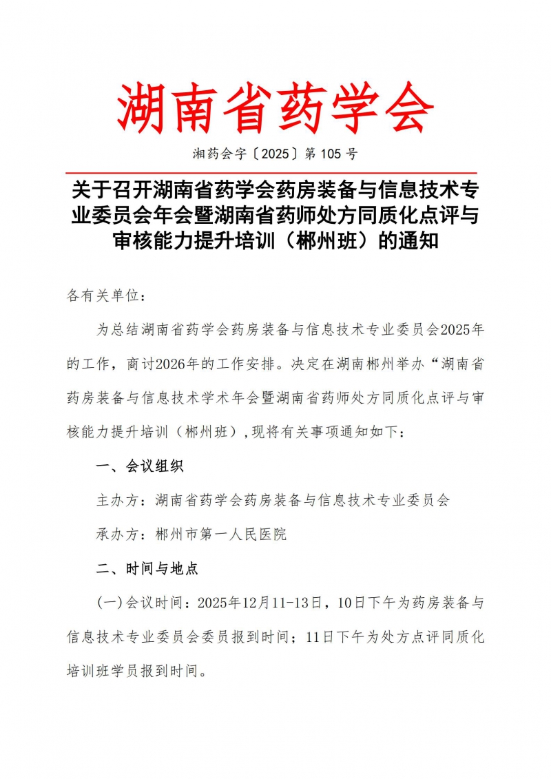 通知下载:/关于召开湖南省药学会药房装备与信息技术专业委员会年会暨湖南省药师处方同质化点评与审核能力提升培训(郴州班)的通知.pdf