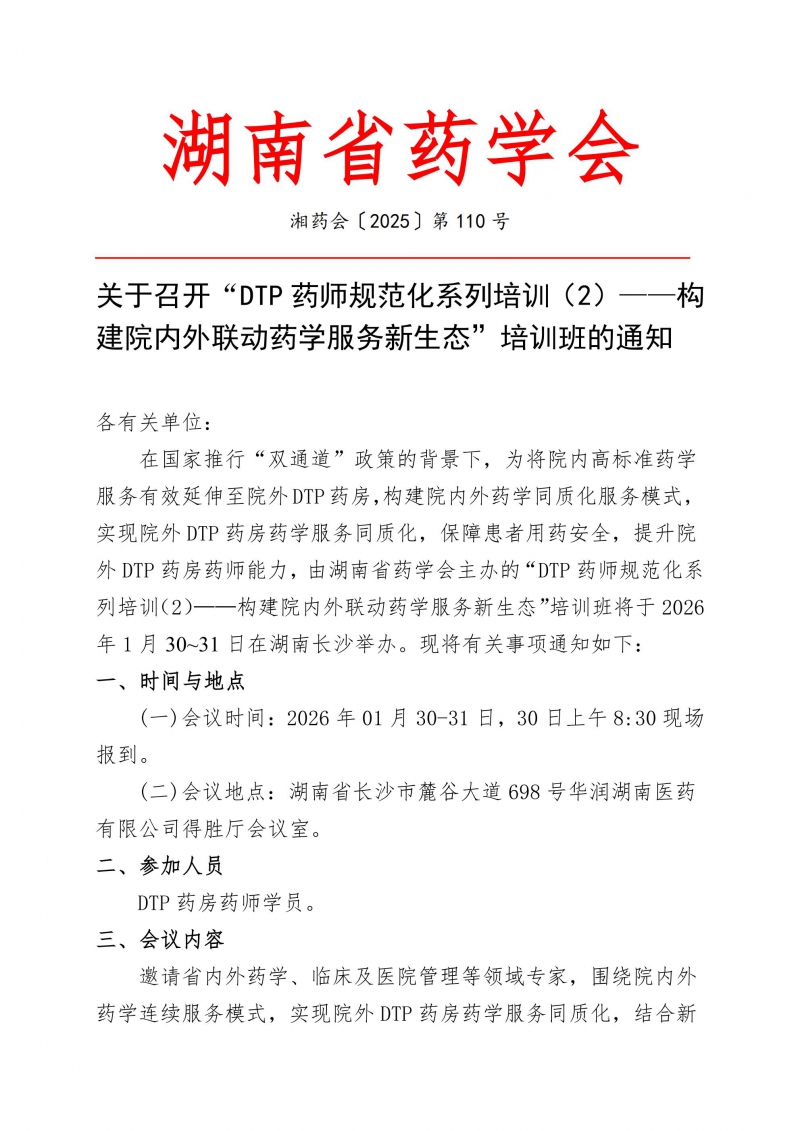 通知下载:/关于召开“DTP 药师规范化系列培训(2)——构建院内外联动药学服务新生态”培训班的通知.pdf