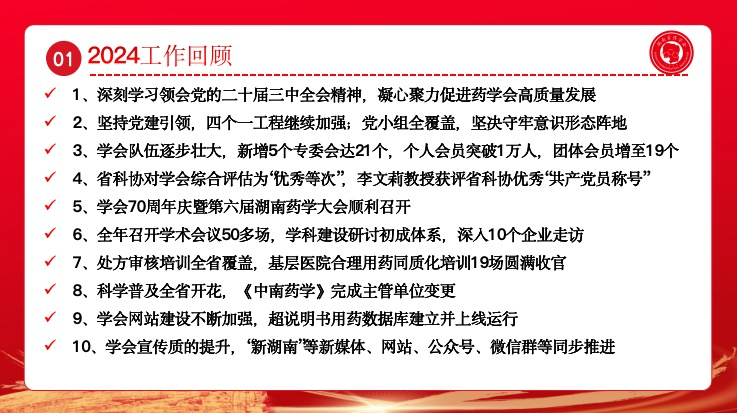 湖南省药学会副理事长兼秘书长张毕奎在会上就学会2024年工作情况及2025年工作计划进行了汇报交流。他重点围绕强化党建引领、深化内部治理、完善组织建设、履行服务职能、拓展学术交流、创新科普宣传、提高科技服务、推动人才培养、承接政府职能、推进信息化建设等十个方面,详细阐述了湖南省药学会在过去一年中所取得的亮点成绩以及未来的发展规划。