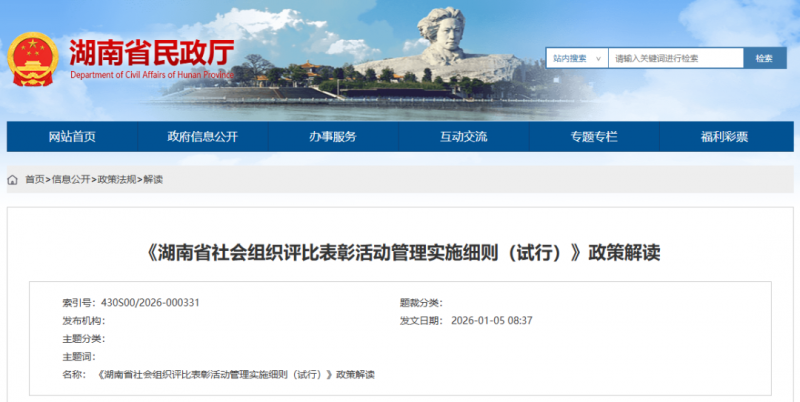 2025年12月30日,湖南省民政厅印发了《湖南省社会组织评比表彰活动管理实施细则(试行)》(以下简称《实施细则》),自印发之日起施行。现将《实施细则》主要内容解读如下: